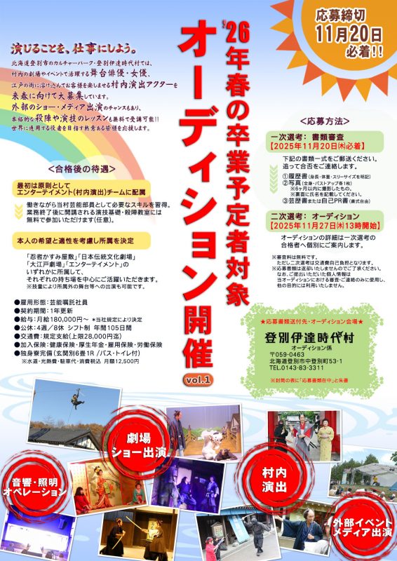 登別伊達時代村では、村内の劇場やイベントで活躍する舞台俳優・女優、江戸の街に溶け込んでお客様を楽しませる村内演出アクターを来春に向けて大募集しています。