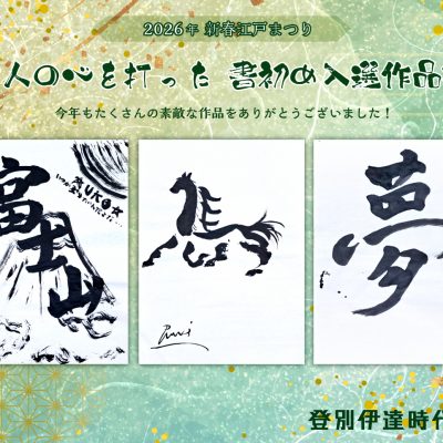 2026年1月1日(木・祝)~3日(土)開催の「新春江戸まつり」は、おかげさまをもちまして盛況のうちに幕を閉じました。 商家街の「書初め」会場も多くの方にご利用いただき、心よりお礼申し上げます。 さてこのたび会場掲示板にお寄せいただいた力作124点の中から、こちらの続きを読む -