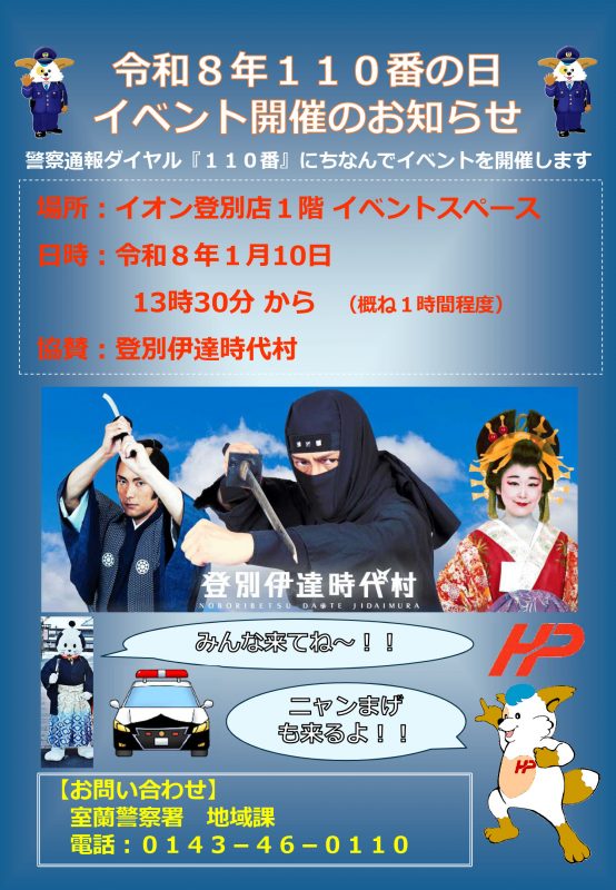 「110番の日」イベント出演のお知らせ [2026年1月4日] 2026年1月10日(土)にイオン登別店にて開催される「110番の日」イベントに、登別伊達時代村の人気者たちが登場します! 侍が一日警察署長を務め、ニャンまげも警察官と協力して110番の正しい使い方をご紹介。 あでやかな衣装のお姫様も加わり、地域の啓発活動を明るく盛り立てます。 ご希望の方は、ご一緒に記念撮影もお楽しみいただけますよ♪ お買い物がてらにでも、どうぞお気軽にお立ち寄りください。 ※本イベントについてのお問合せは室蘭警察署地域課(℡ 0143-46-0110)までお願いいたします。