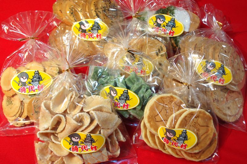 This shop offers rice cracker senbei, fried arare, and of course Jidaimura's famous flavored senbei crackers (nori seaweed, soy sauce, sour plum sugar, shichimi hot pepper).